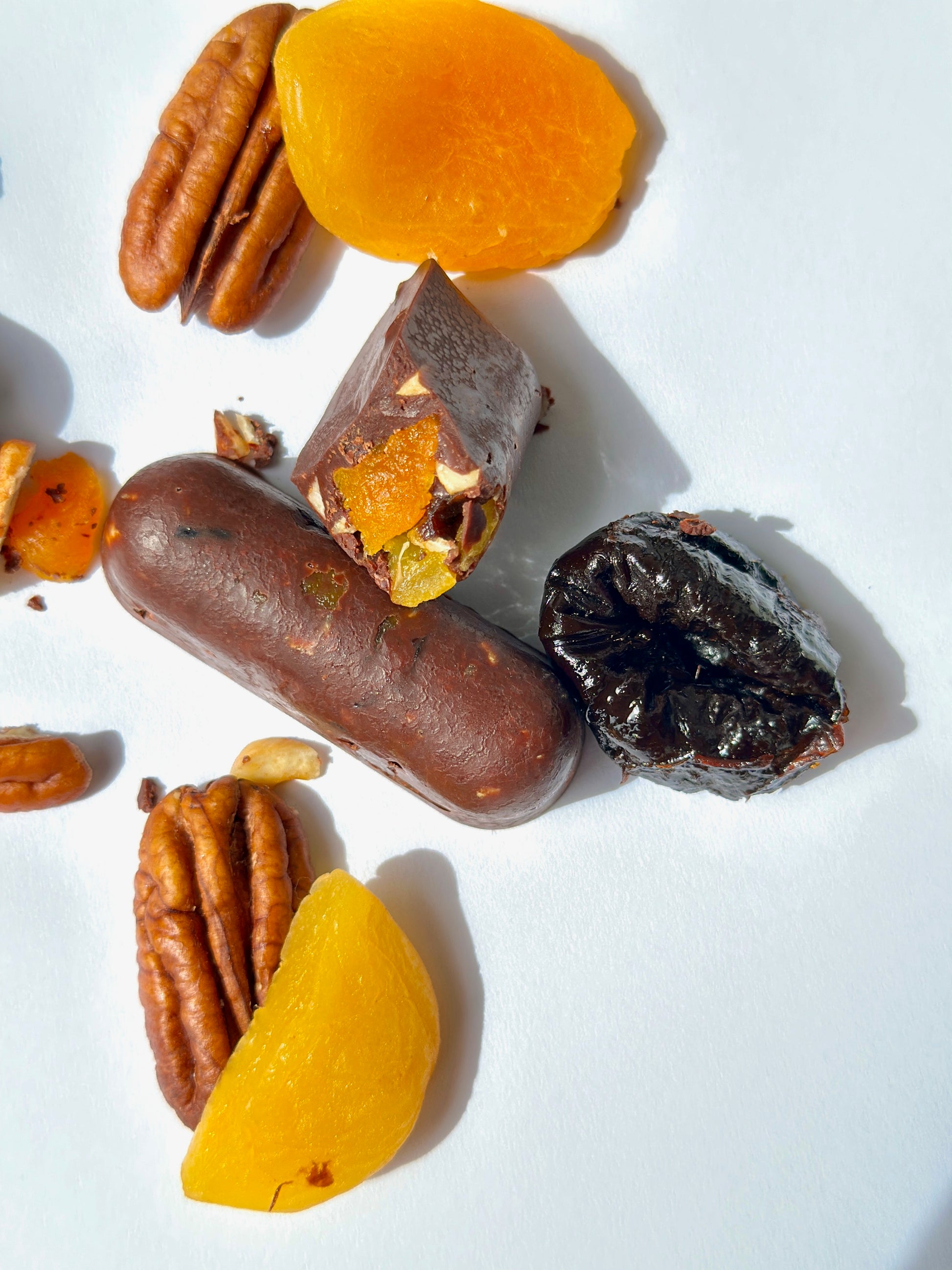 A sophisticated combination of rich dark chocolate, sweet dried apricots, succulent prunes, and roasted pecans