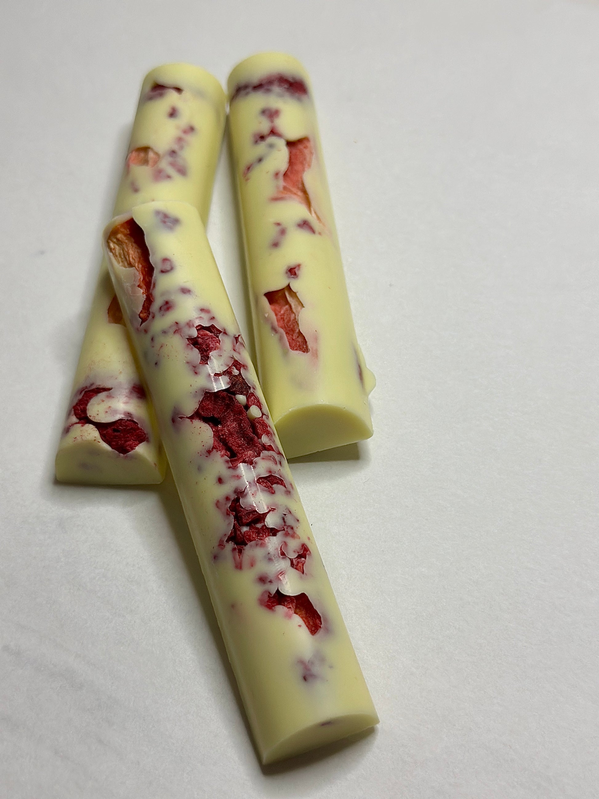 Silky white chocolate paired with dried raspberries and strawberries, creating a refined harmony of sweetness and natural berry tartness